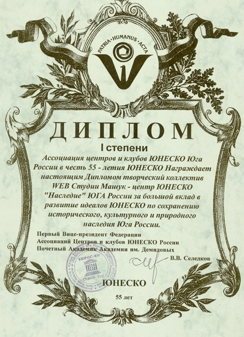 В 2001году в ноябре нашу Wеб-студию МАШУК.РУ наградили Почетным Дипломом в честь 55 летие ЮНЕСКО.