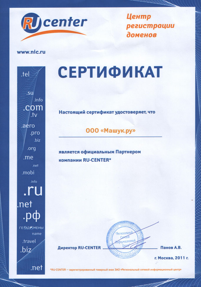 Мы являемся партнером АНО "Региональный Сетевой Информационный Центр" (RU-CENTER), ведущего регистратора доменных имен. RU-CENTER является крупнейшим оператором доменных имен в России, у вас никогда не будет проблем с переносом имени, при желании вы сможете управлять именем самостоятельно. RU-CENTER (ЗАО «Региональный Сетевой Информационный Центр») — первый в России и крупнейший профессиональный регистратор доменов и один из ведущих хостинг-провайдеров.