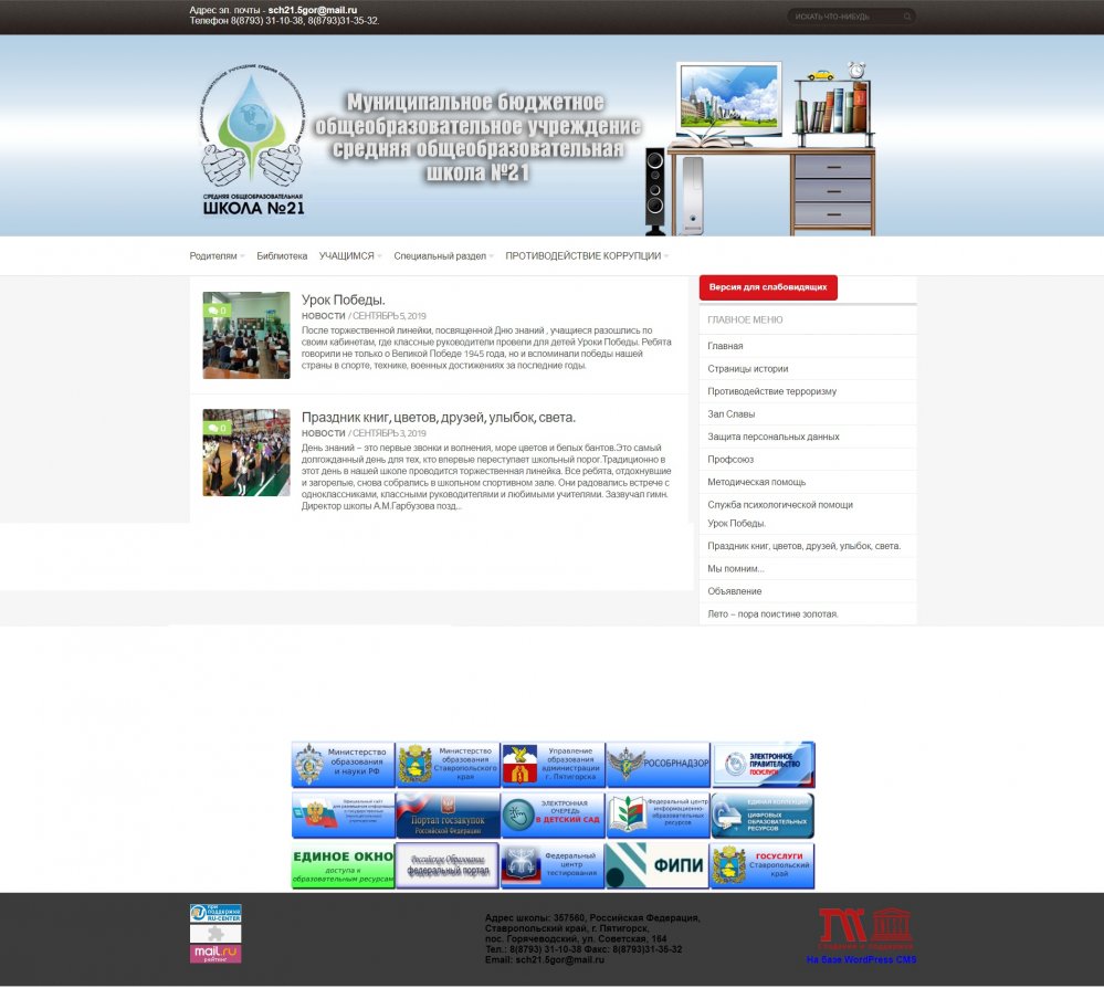 К началу нового учебного года, запущен обновленный сайт для образовательного учреждения №21 г. Пятигорска, который полностью соответствует требованиям законодательства Российской Федерации! В связи с требованием закона об образовании для организации доступности информации об образовательном учреждении создаются сайты образовательных учреждений.