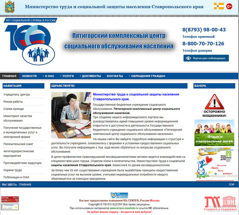 В ежедневном рабочем ритме, в череде всевозможных событий, мы подошли к важной исторической дате -100-летию, c выпуском обновленного сайта для ГБУСО «Пятигорский комплексный центр социального обслуживания населения» Министерства труда и социальной защиты населения Ставропольского края.