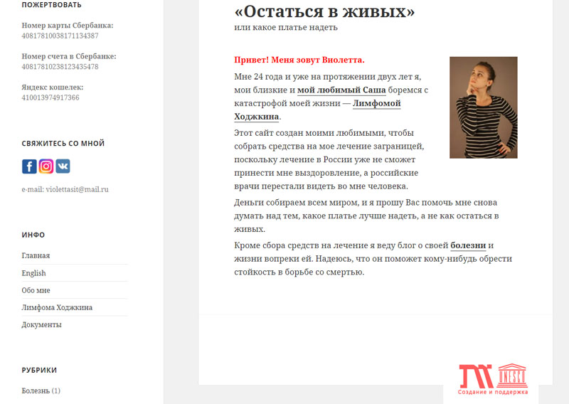Web студия Машук.ру разработала сайт для Виолетты, которая борется с лимфомой Ходжкина.