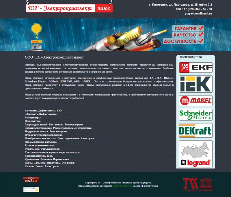 Веб-сайт «ЮГ- Электрокомплект плюс» протестирован со всех точек зрения - от технической до потребительской. Компания поставляет высококачественное электрооборудования отечественному потребителю и является приоритетным направлением деятельности компании.