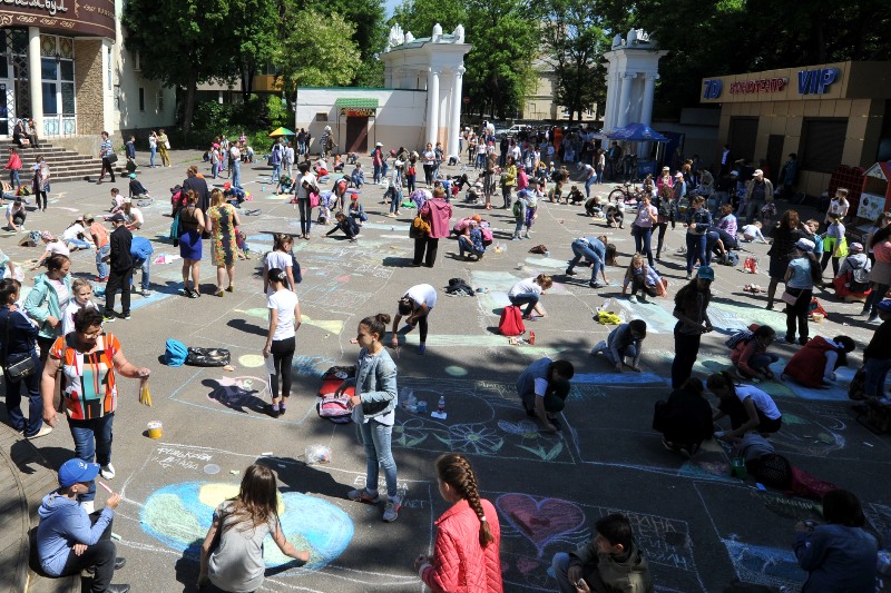 В этот день парковая площадь заиграла палитрой красок. Праздник детства открыл уже ставший традиционным и полюбившийся городской детворе конкурс рисунка на асфальте «Мир, в котором мы живём».