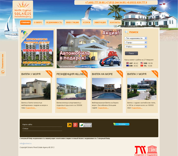 Вы сможете найти массу материалов и различной информации по поводу того как купить недвижимость на Кипре. Лучшее средство это узнать самому – приехать, посмотреть, послушать, сравнить, подумать, приехать еще раз, и тогда сделать окончательный выбор.Веб-сайт помогает Переселению наших Соотечественников на Северный Кипр. Сайт выполнен на платформе Joomla + Virtuemart. За основу был взят готовый шаблон и переработан по желанию заказчика. Проведено комплексное изменение модульных позиций на сайте.
