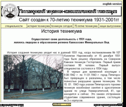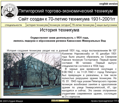2001 Студия "Машук" выпустила ВЕБ-сайт к 70 летию "ПТЭТ" Пятигорский торгово-экономический техникум существует с 1931 года, является государственным учебным заведением Министерства образования Российской Федерации.