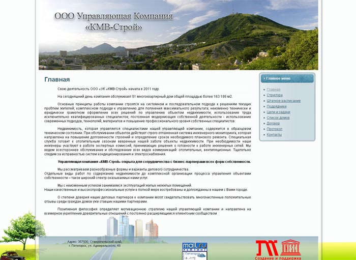 <На сайте ООО «УК «КМВ-Строй» можно посмотреть перечень домов, находящихся в управлении компании, узнать телефоны коммунальных служб и тарифы коммунальных услуг, посмотреть актуальные объявления.