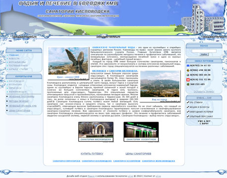 КМВИС-ТУР ведёт работу в сфере Санаторно-курортного лечения. Теперь любой пользователь «всемирной паутины» сможет на одном ресурсе получить актуальную информацию о важнейших событиях cанаторно-курортного лечения на КавМинВодах. Wеb-сайт создан с помощью CMS Ucoz.